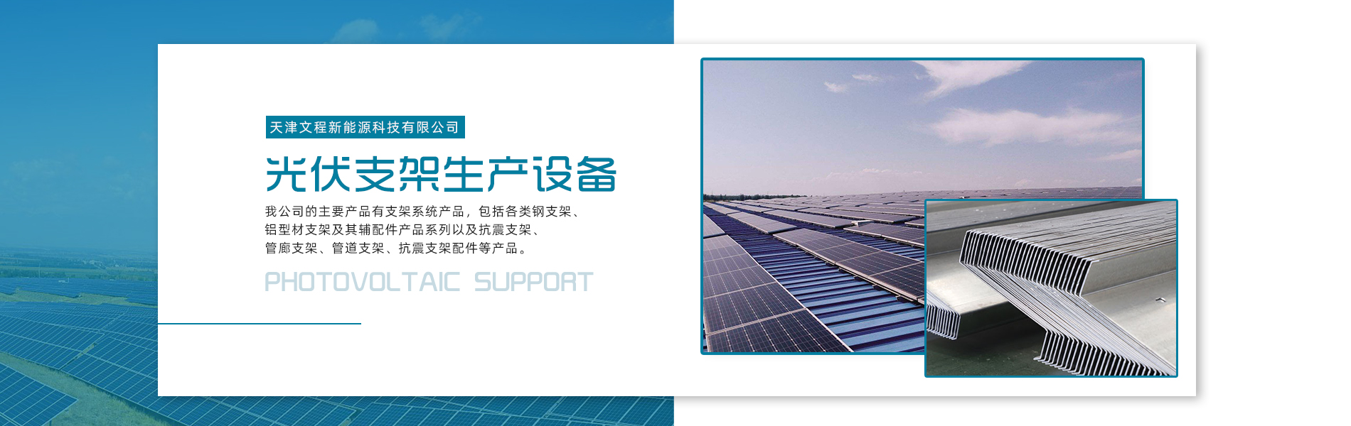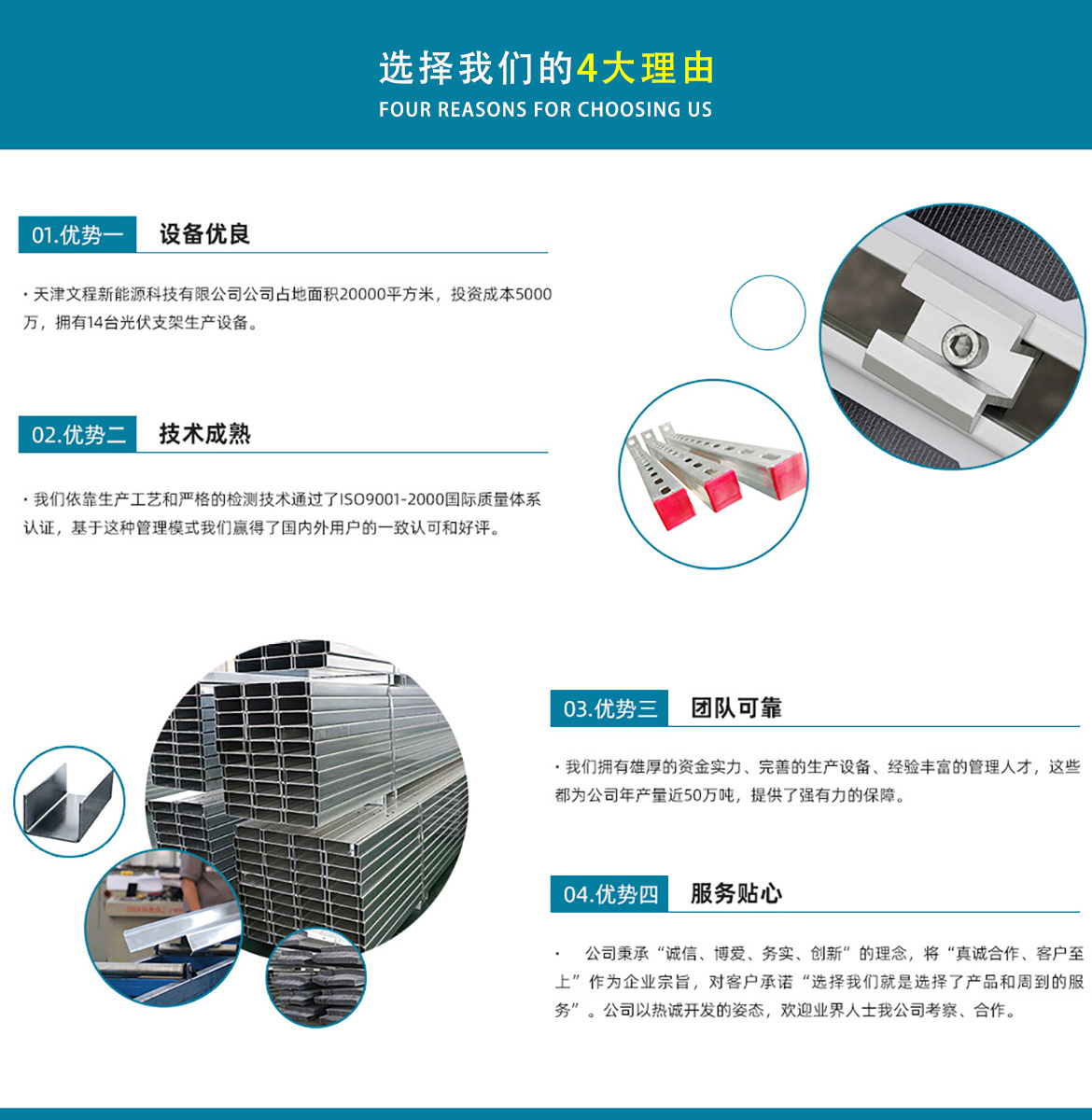 天津文程新能源科技有限公司成立于2021年,是專注于集中式、分布式、漁光互補(bǔ)和農(nóng)光互補(bǔ)等清潔能源發(fā)電的綜合性企業(yè) 公司是集設(shè)計(jì)、研發(fā)、生產(chǎn)、制造為一體的綜合型企業(yè)。公司占地面積20000平方米,注冊資金5000萬元整。公司坐落于華北鋼鐵重鎮(zhèn)--大邱莊,距天津市區(qū)50公里、鄰104和205國道及京滬高速,交通十分便捷。 本公司擁有三個(gè)生產(chǎn)車間,其中兩個(gè)冷彎型鋼車間,一個(gè)鋅鋁鎂型鋼車間,擁有自動(dòng)冷彎成型機(jī)10條,自動(dòng)數(shù)控沖孔機(jī)10條以及焊接加工等設(shè)備。主要生產(chǎn)產(chǎn)品有:太陽能光伏支架、各種規(guī)格的C/Z/U型鋼、抗震支架、管廊支架及整套配件等。